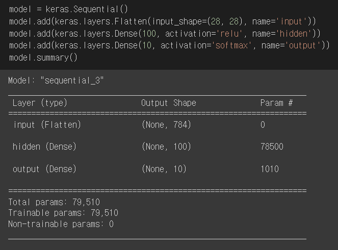 (뉴런의 개수, activation='뉴런의 출력에 적용할 함수', input_shape=(입력의 크기))를 매개변수로 받는다.